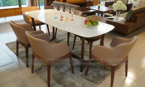 Bàn đẹp phải cần có ghế sang. Ghế kết hợp cùng bàn ăn mặt đá Trail là ghế có khung gỗ óc chó, bọc đệm da PU, màu sắc nhã nhặn. Khách hàng có thể lựa chọn 1 trong 2 mẫu ghế tại showroom là ghế ăn Trail hoặc ghế ăn Adele. Cả 2 mẫu ghế ăn này mang lại cảm giác mới mẻ, hiện đại cho trọn bộ sản phẩm.